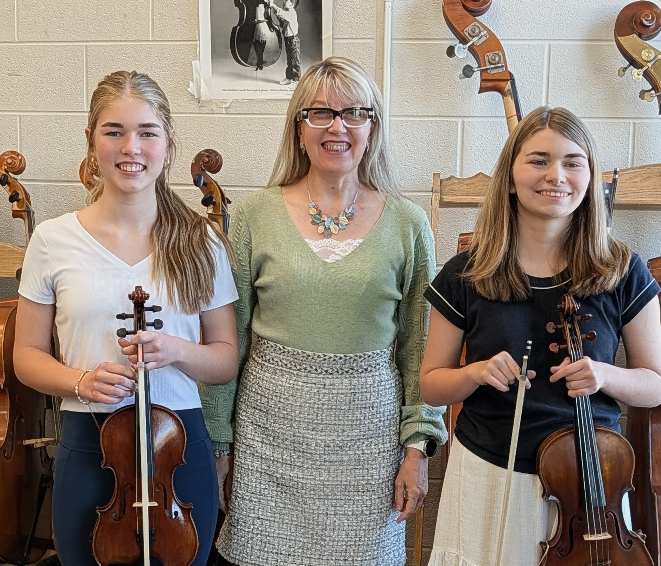 Kaela will play the viola in the symphony orchestra, and Kara will play the violin in the string orchestra.